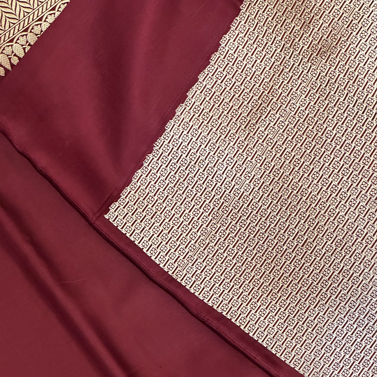 Each weave is a masterpiece of Banaras craftsmanship — showcasing intricate motifs and fine zari detailing that shimmer with regal grace. The deep burgundy tone adds a touch of opulence, making it an exquisite choice for evening celebrations or grand festivities.