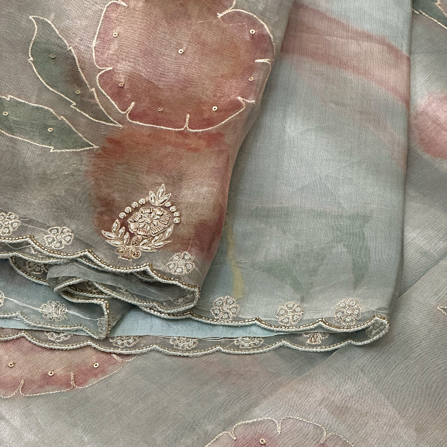 Digital Printed Tissue Organza Saree with Hand Embroidery Detailing