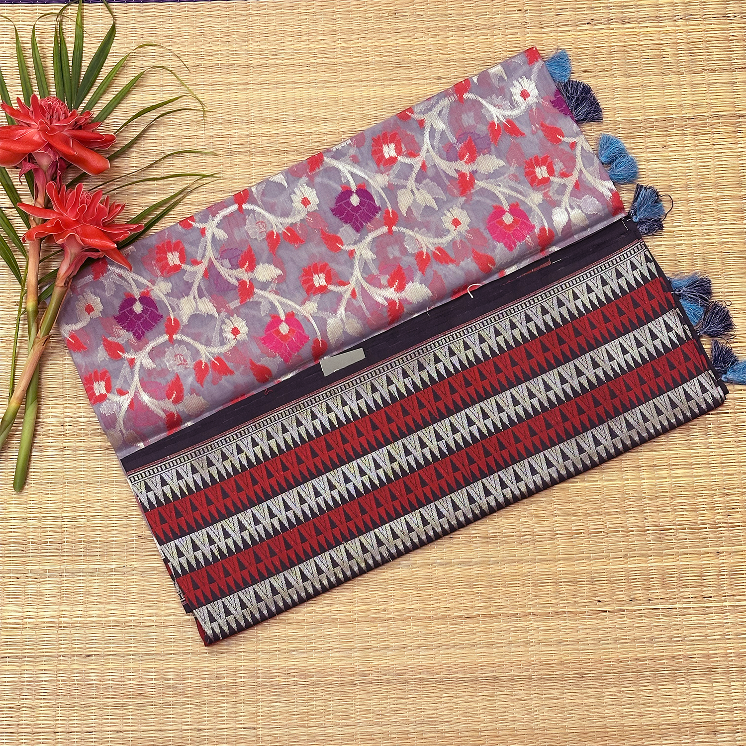 A vision of refined luxury, this Metallic Grey Kora Tissue Banarasi Saree beautifully blends shimmer with heritage artistry. The sheer kora tissue fabric creates a luminous metallic base, while the saree is adorned with an exquisite Meenakari floral pattern — a craft known for its colourful detailing woven into zari threads.