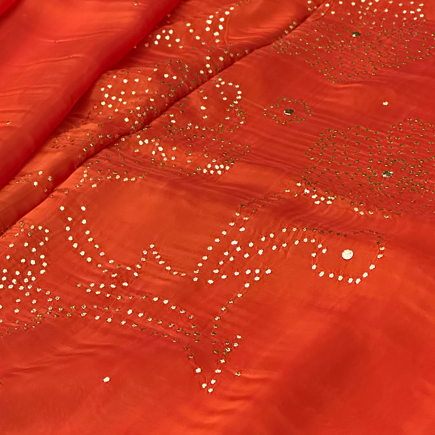 Radiant and fluid, this orange modal satin saree is designed to make a graceful statement. The rich satin sheen paired with intricate badla work adds festive brilliance, while the soft modal base ensures an effortless drape—perfect for celebrations that call for understated glamour.
