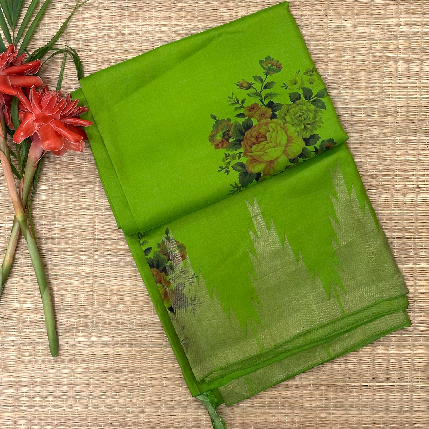 Parrot Green Kanchipuram Silk Saree with Digital Print and Antique Temple Border
