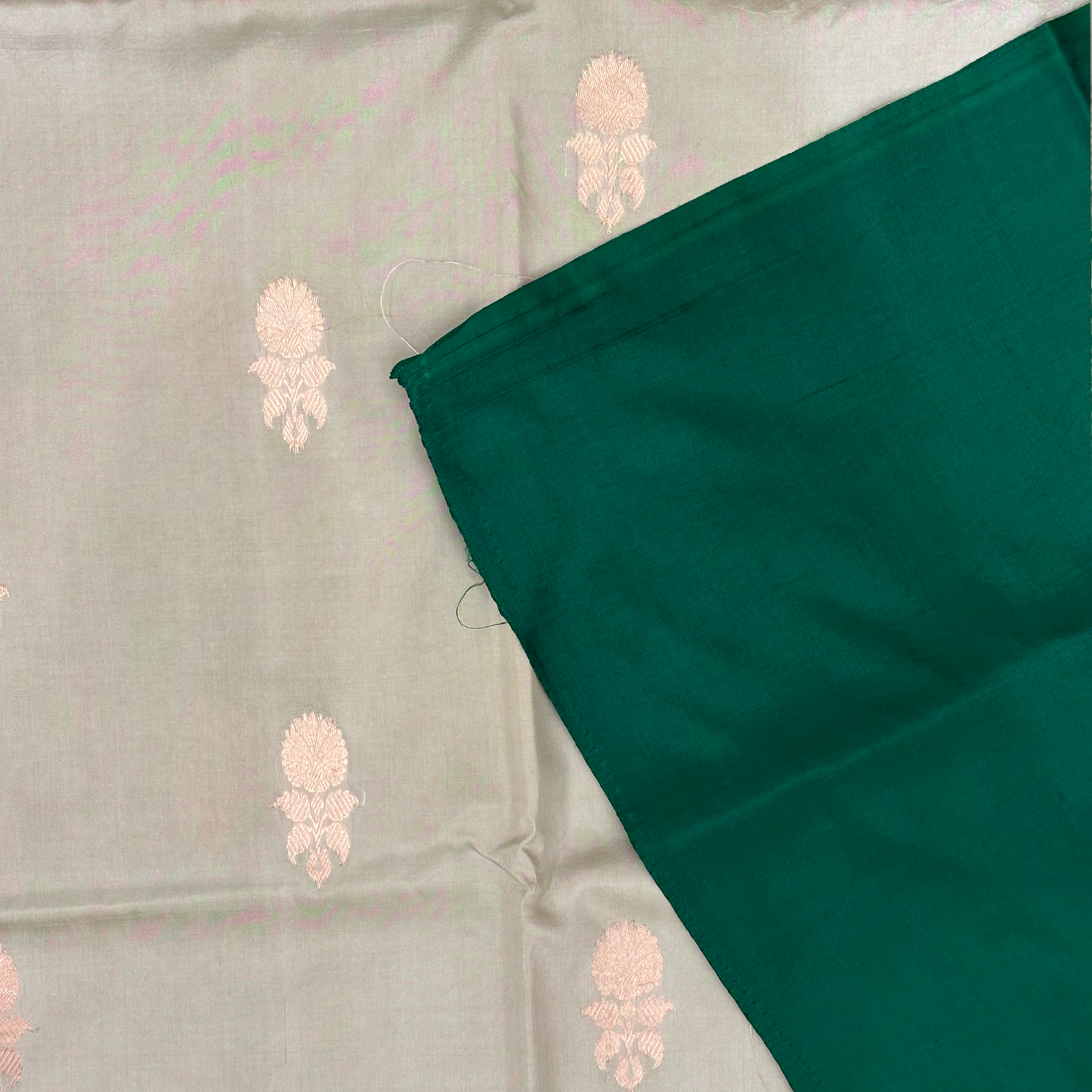 The saree features an intricate weave pattern across the body, showcasing the artistry and precision of traditional Banarasi craftsmanship. Luxurious in texture and luminous in tone, it’s a perfect pick for weddings, festive occasions, or elegant celebrations.
