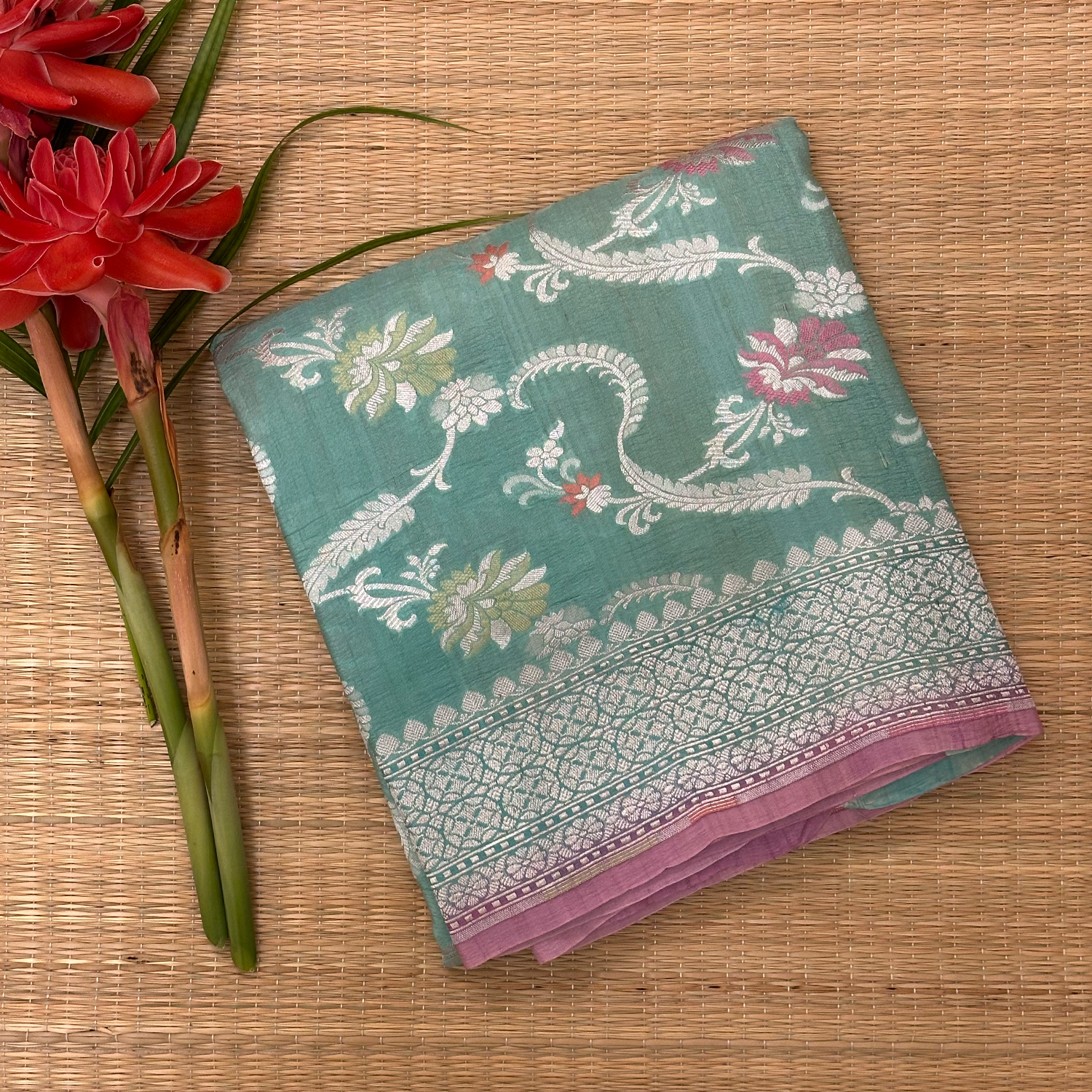 Turquoise Blue Tussar Banarasi Saree with Meenakari Floral Pure Zari Weave